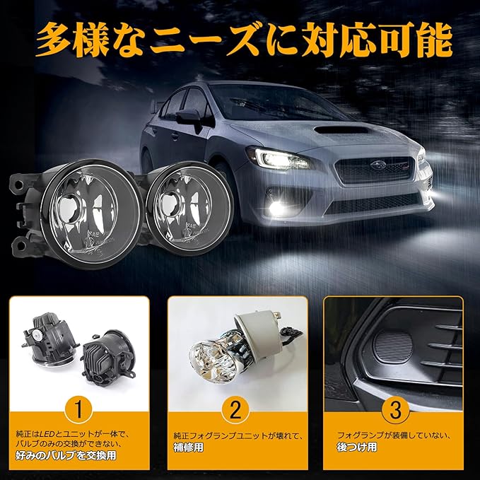 純正フォグランプが一体でLED化されており、暗くて、バルブのみの交換ができない、フォグランプが装備していない車を乗っている、純正ハロゲンフォグランプのユニットが壊れている、いろんな状況でフォグランプユニットを交換したい方々におススメ。(※LEDバルブは別売り)