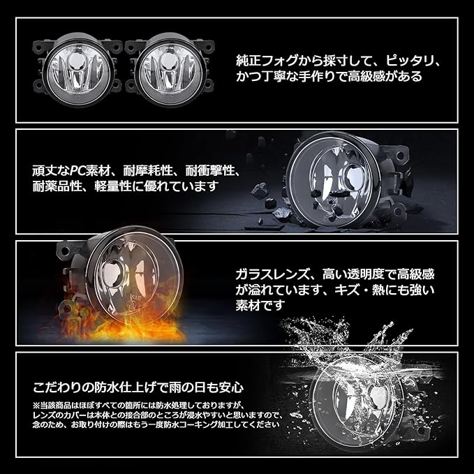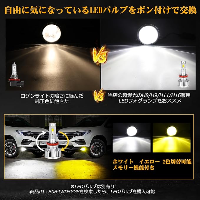 交通事故総合分析センターによると、濃霧や豪雨の際には交通事故に至るケースが通常の4倍にまで増えます、そこで、濃霧や豪雨での運転は明るい、天候に応じて色が切り替われるLEDが必要です。当該フォグランプユニット+当社の爆光H8/H9/H11/H16 LEDフォグランプ(「B0B4WD5YGS」を検索して、別途に購入可能)をお勧めします。