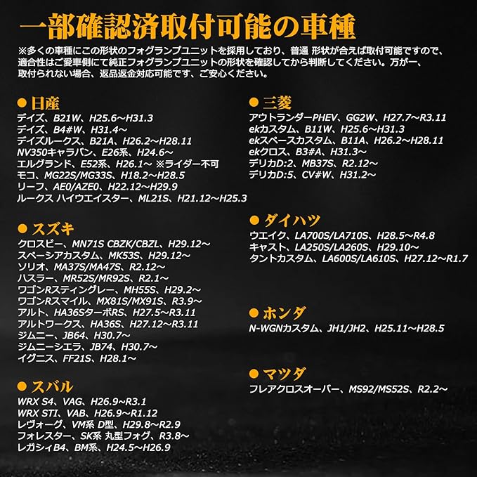 多くの車種にこの形状のフォグランプユニットを採用しており、汎用品です。例えば、デイズ、NV350キャラバン、エルグランドE52、ワゴンR、ジムニー、レヴォーグ、デリカ、タントカスタム、N-WGNカスタムなどに適合、より詳しい適合車種情報は商品の説明までご確認くださいませ。
