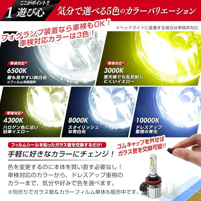 【気分で選べる5色のカラーバリエーション】フィルムシールを貼ったガラス管を交換するだけで、気軽に好きなカラーに変更可能。フォグランプに使用するなら車検対応!スタンダードなカラーからドレスアップ重視のカラーまで、気分や好みで色を選べます。 ※ガラス管はデリケートな部品です。強い衝撃を受けると破損の恐れがございますので、丁寧に扱っていただくようお願いいたします。※ヘッドライト使用は車検非対応。