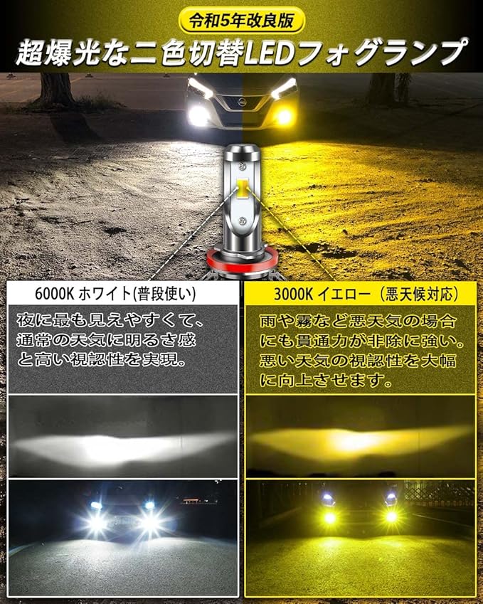 ⭐【便利な2色切り替え】バルブのみの簡単交換でフォグを白とイエローに切り替え。フォグランプのスイッチON/OFFで切り替え可能です。普段は純白でかっこよく。雨や雪なと悪天候はイエローで視認性バツグン。安心・安全なカーライフを送りましょう!