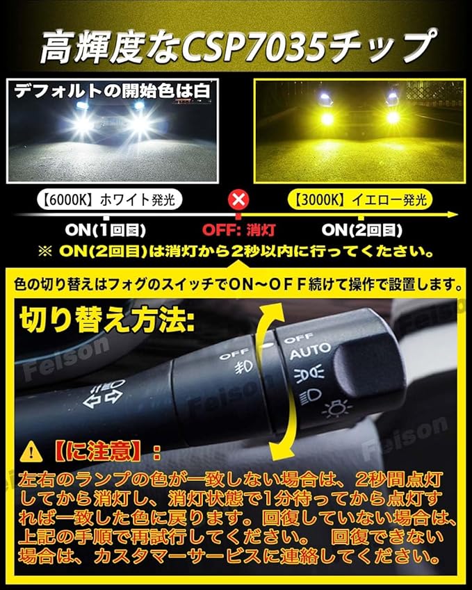 ⭐【超爆光フォグランプ】本商品は。当初より開発を進めていたFeison製新型2色CSP LEDチップが完成し搭載しました。12000Lmの明るさで純正ハロゲンより明るく、最強のカットラインを実現。また高品質LEDチップを採用していますので長寿命、放熱性、省電力効果抜群の逸品です。(ご注意:ヘッドライトには適用されません)