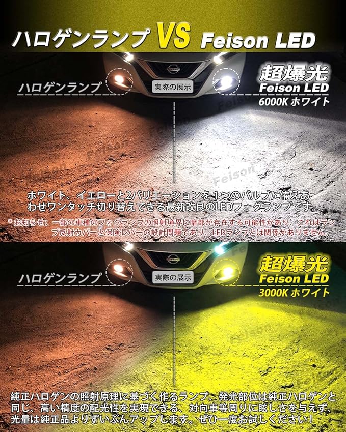【令和最強 爆光 】Feison H8/H11/H16 led 2色切り替え カラーチェンジ バルブ フォグランプ専用 フォグランプ led 2個1セット ホワイト イエロー メモリー機能 12V車用 日本語説明書