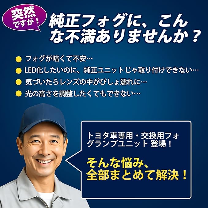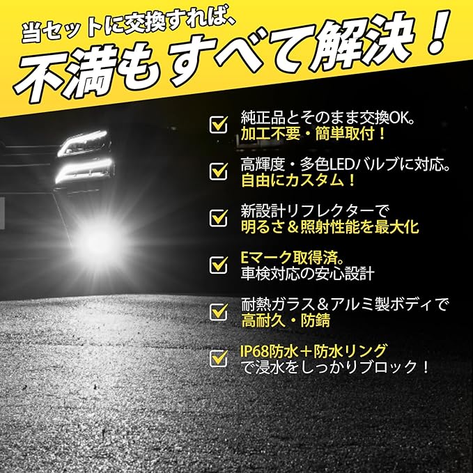 【取付簡単】純正フォグユニットと同形状なので、加工不要でそのまま交換可能。配線やバンパー加工も不要で、DIY感覚で簡単に取り付けられます。「もっと明るくしたい」「LEDバルブを自由に選びたい」――そんな願いを、スマートに叶えます。