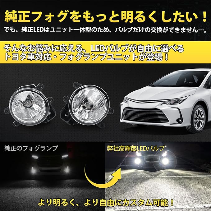 【適合車種例】プリウス30 α、80系 ヴォクシー/エスクァイア/ノア、30系 アルファード/ヴェルファイア、アクア10系、カムリ 50系 70系、カローラルミオン150系、ランドクルーザープラド 150系後期、クラウン210系、C-HRなど適合。純正フォグランプはH16の場合、あるいは、純正フォグランプはLEDの場合、適合可能です。純正フォグランプはH11の場合、適合不可です。