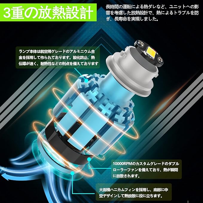【3重の放熱設計】①ランプ本体は航空用グレードのアルミニウム合金を採用して作られております。酸化防止、熱伝導が速く、耐熱性などの利点を備えております。 ②大面積ハニカムフィンを採用し、底部に中空デザインして熱放散に役に立ちます。③10000RPMのカスタムグレードのダブルローラーファンを備えており、熱が瞬間に放散されます。長時間の運転による熱ダレなど、ユニットへの影響を考慮した放熱設計で、熱によるトラブルを防ぎ、長寿命を実現しました。