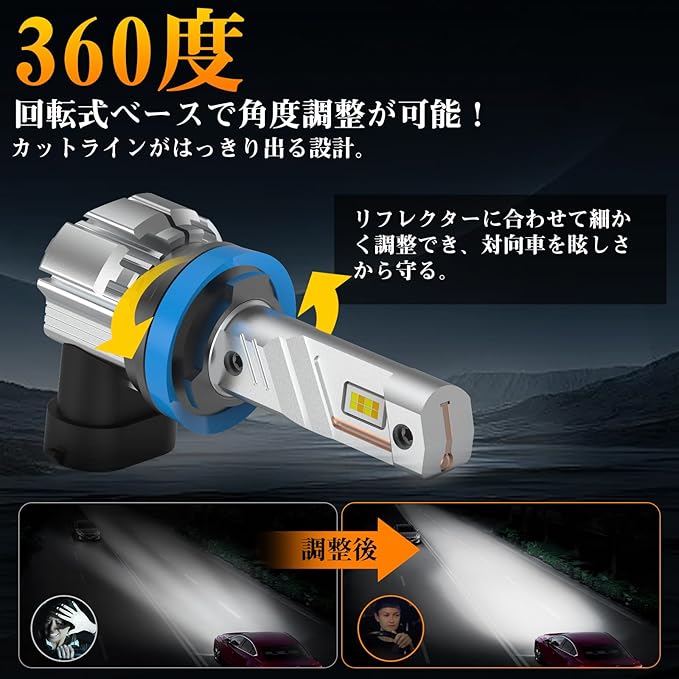 【360 角度調整可能・車検対応】純正バルブと配光が合わず、照射バランスに違和感を感じたことはありませんか? Perrace h8 led フォグは、回転可能な台座構造により、車種ごとのリフレクター形状に合わせて照射角度を微調整可能。(H11・H16 LEDにも対応) 配光バランスを整えやすく、対向車への眩しさを抑えながら、路面を自然に照らします。 純正ハロゲンに近い照射位置を意識した設計で、違和感の少ない見え方をサポートします。