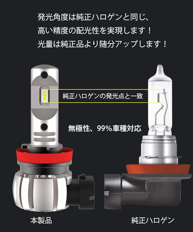 【高い精度の配光性&角度調整可能】このLEDバルブは純正ハロゲンの発光点と一致することを実現しました、発光角度も純正ハロゲン球と同じなので、高い精度の配光性を実現した!ハロゲンの照射原理を全く参考して、配光自体は非常にクッキリとした綺麗なカットラインが出ており、対向車や周りにも迷惑な眩しさが無くて、完全に純正ハロゲンを再現することができました。それに、同梱の取付金具を利用してフレクターの形状に合わせて取付角度を調整して、配光が一番良いところに調整可能です!