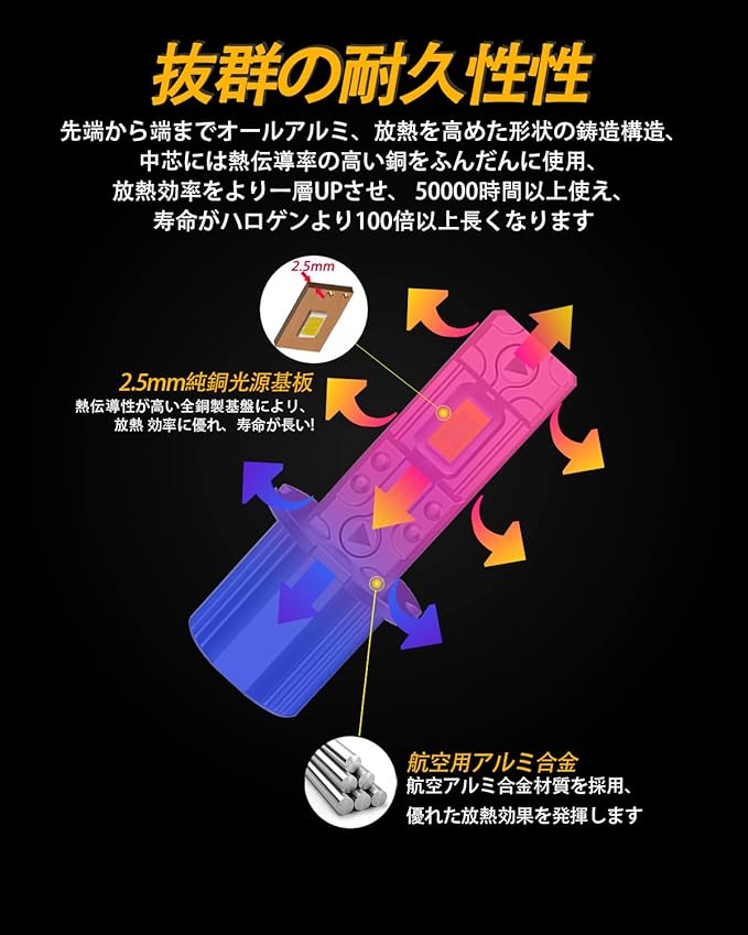 【優れる放熱&防水性能】先端から端までオールアルミ、放熱を高めた形状の鋳造構造、中芯には熱伝導率の高い銅をふんだんに使用、放熱効率をより一層UPさせ、高温にも耐えられる非常に優れた耐熱性・放熱性を実現!IP67レベルの優れた防水・防塵性能で、粉塵と雨水の侵入を有効に防止して、様々な天候でもドライブを安全、快適に!より長い使用寿命を実現しました!