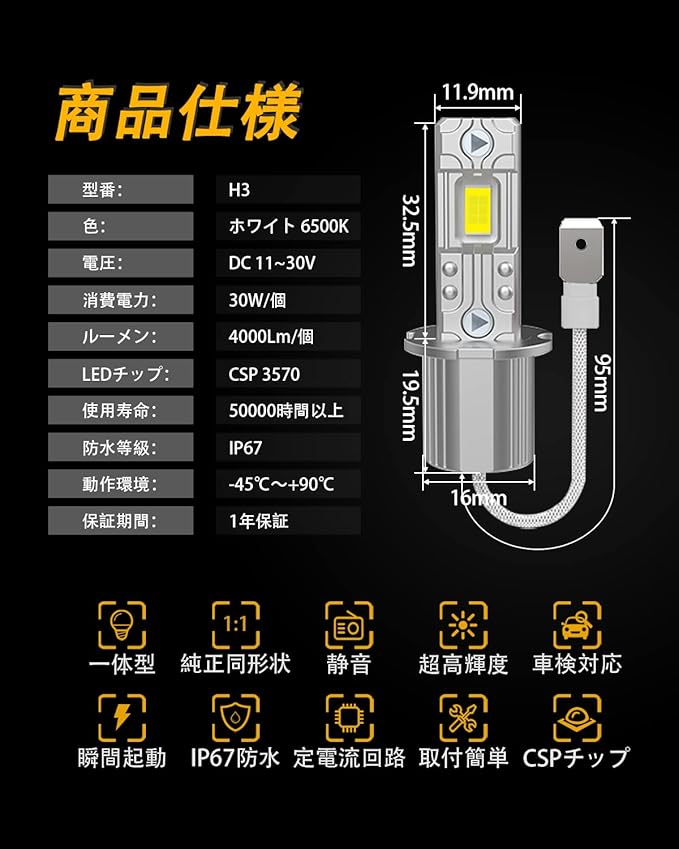 【商品 スペック】型番:H3、色:ホワイト 6500K、電圧:DC 11~30V、ルーメン:4000Lm/個、LEDチップ:CSP3570、使用寿命:50000時間以上、防水等級:IP67、動作環境:-45℃~+90℃