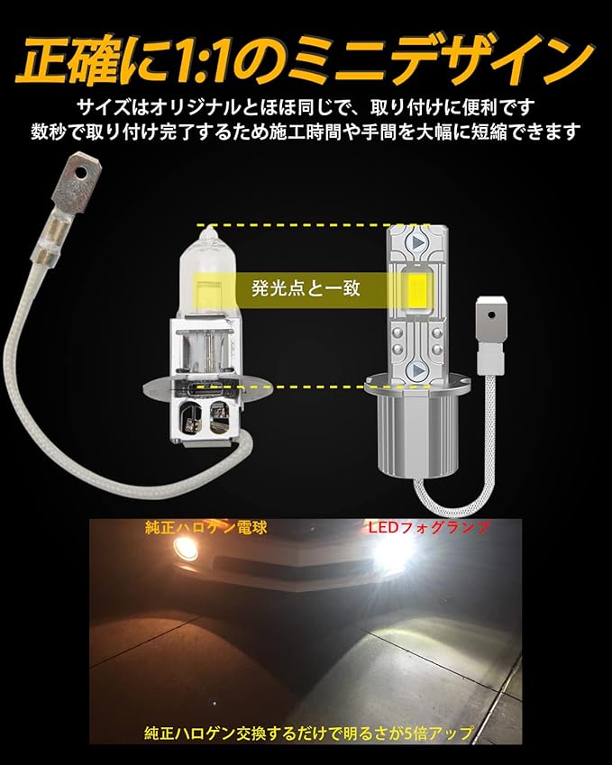 【取り付き簡単】ハロゲンのサイズとほぼ一致だけではなく、 一体型の製品で複雑なコネクタや配線がないから、直接交換可能です。 純正バルブより大幅に明るさと視認性を高めています。防電磁干渉、超高速起動0.1秒。 直接交換可能です。初心者でも楽に取り付けします。