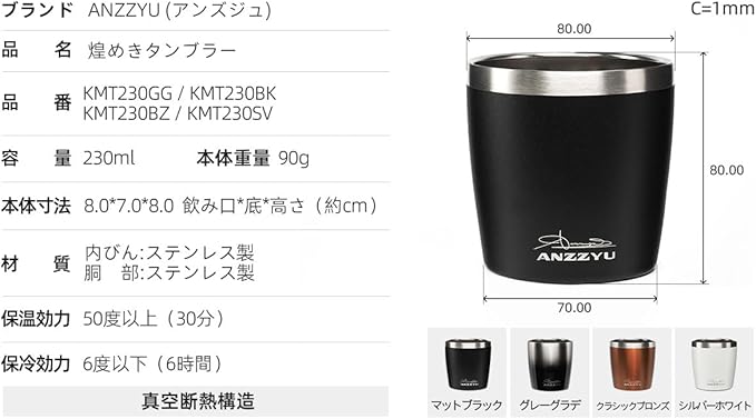 保温・保冷 真空二重構造で結露しない、カップ自体の保温性,保冷性を高めています飲み口がより薄く設計され、口当たりが良くなります。