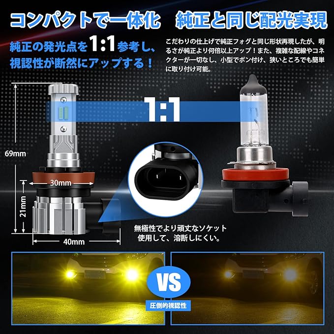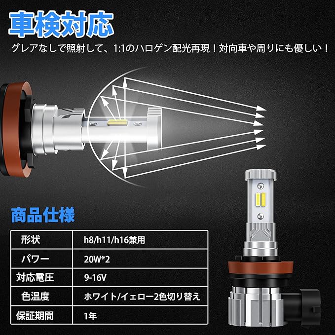 【ポン付け】全新一体化設計H8 LED フォグ 2色切り替え、ファンレス設計でとてもコンパクトな見た目、また、複雑なコネクタや配線一切なし、純正バルブと交換だけで、取り付け完了です。初心者でも簡単に操作できます。さらに、無極性で従来品より頑丈なソケット使用して、溶断しにくい。
