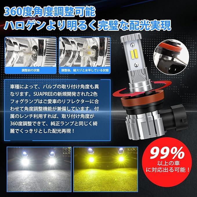 【360 角度調整 】H8 LEDフォグランプがたくさんあって、どうやって選らぶことに迷ってますか。車種によって、ledフォグランプの取り付け角度も異なります。せっかく購入したのに、不適用なら大変!皆様の顧慮を徹底的に解消するように、SUAPREEの新規開発されたH8 LED フォグ 2色はご愛車のリフレクターに合わせて角度調整機能が兼備しています。付属のレンチ利用すれば、LEDフォグランプの取り付け角度が360度調整できて、純正ランプと同じく綺麗でくっきりとした配光再現!グレアなしで照射して、対向車や周りにも優しい!様々な車種にも対応可能になります。