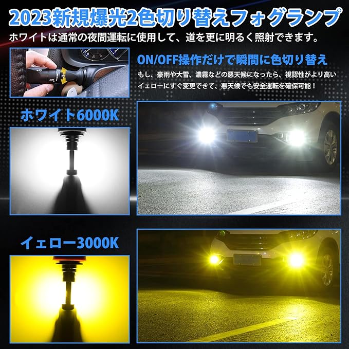【H8 LED フォグ 爆光】暗い純正フォグランプにうんざりしたか?LEDを交換して、車検が通らなく、取り付けもめんどくさいなどの不安がありますか? SUPAREE 最新H11 LED フォグランプ 2色切り替えを試しましょうか。純正の発光点1:1参考し、正確な配光を実現して視認性が従来品やハロゲンより断然にアップ!さらに、スイッチを繰り返すだけでホワイトとイエロー、アイスブルーを切り替えます。6000Kのホワイトは明るさを上がり、夜間運転更に安全、安心になります。3000kのイエローは雨や雪、霧などの悪天候に適して、高い視認性を持ちます。悪天候でも視認性を確保できる。アイスブルーが加えて、日常の使用や撮影用もピッタリで派手な感じ!おしゃれで個性が溢れています。より快適なドライブしましょう!お気軽に色を変えたい方にもおススメです!