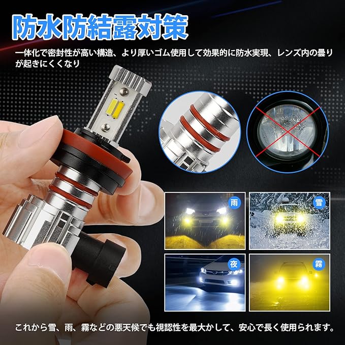 【2重防水防結露対策】従来のH11 LED フォグランプは結露対策が不十分であったため、フォグランプに水が入ってしまった、レンズ内に水滴が付いて曇っているという問題がよく聞いています。こちらのH11 LED フォグランプは一体化で密封性が高い構造、外はより厚いゴム使用して、裏に二重防水リングが付いていて効果的に防水実現、レンズ内の曇りが起きにくくなり。これから雪、雨、霧などの悪天候でも視認性を最大かして、安心で長く使用られます。最新H11 LED フォグランプ使用して、雨の日も安心!