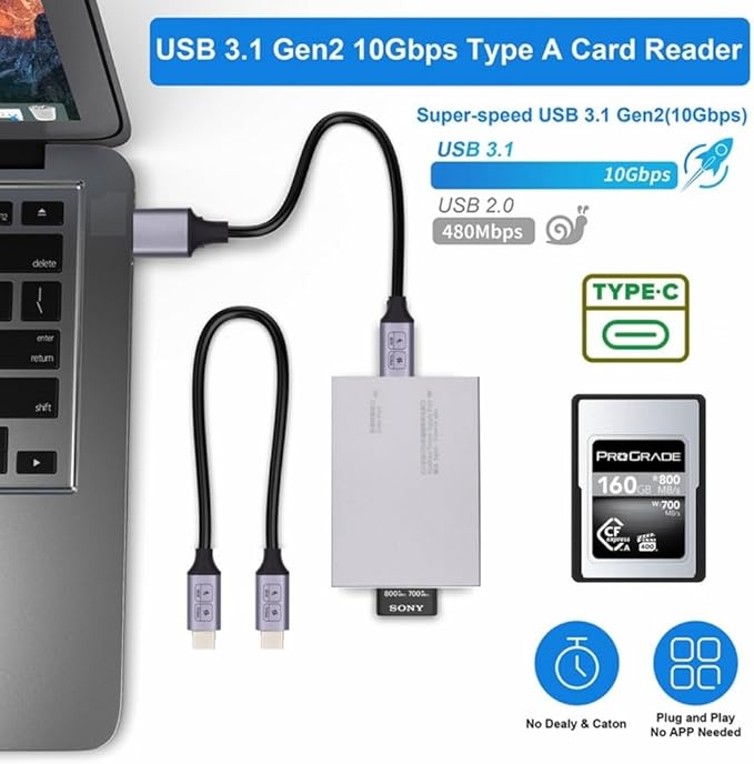 製品の用途: CFexpress カードを USB3.0 または USB3.1 スロットに拡張するのに適しています。(XQD カードには対応していません)。CFexpress メモリ カード USB 3.1 Gen 2 は、Windows、Mac、Linux などのさまざまなプラットフォームと互換性があり、PC、デスクトップ、Mac、iPad で使用してデータ転送を容易にできます。また、タイプ C コネクタをサポートしているため、簡単に差し込んだり取り外したりできます。
