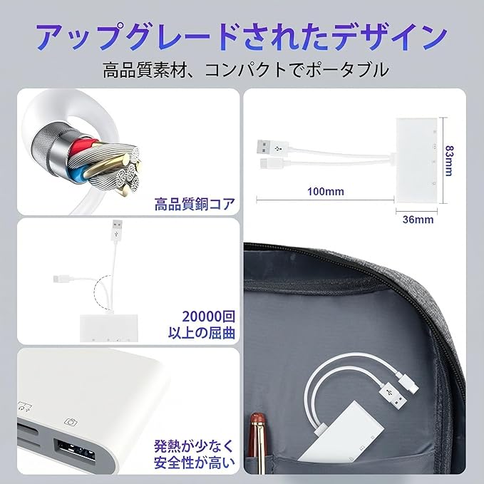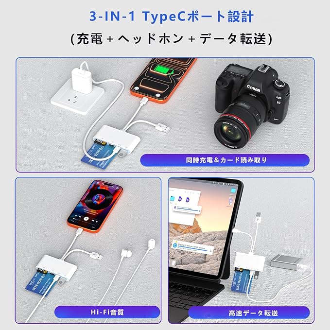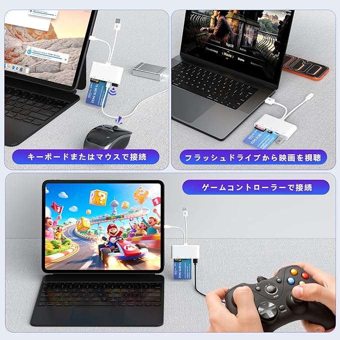 【多機能 USB OTG アダプター】iPhone 用 USB アダプターなら、高速転送で Excel/Word/TXT/PDF といったドキュメントや、MP3/MP4/JPEG/RAW 形式の写真・動画を瞬時に Type-C デバイスへ移せる!特に iPhone 16 ユーザーにもぴったりで、USB フラッシュドライブ・ハードドライブはもちろん、MIDI キーボードやマウス・キーボードといった周辺機器にもスムーズ接続。この SDカードリーダー があれば、データ管理も機器拡張もラクラク、生活がぐっと便利になります!