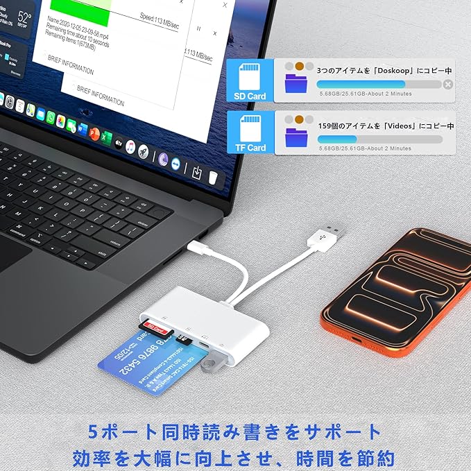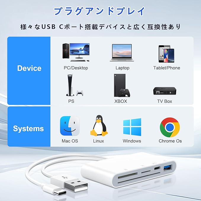 【5-in-1 Type C 多機能カードリーダー】当社の カードリーダー マイナンバーカード対応は5種類のポートを搭載:SDカードスロット+TF(マイクロSD)カードスロット+スマートカードスロット+フル機能Type-Cポート+USB OTGポート。(注:本USB C SDカードアダプターはSDカードとマイクロカードを同時読み取りできませんが、SD/マイクロカードとUSB周辺機器を同時に認識可能です)