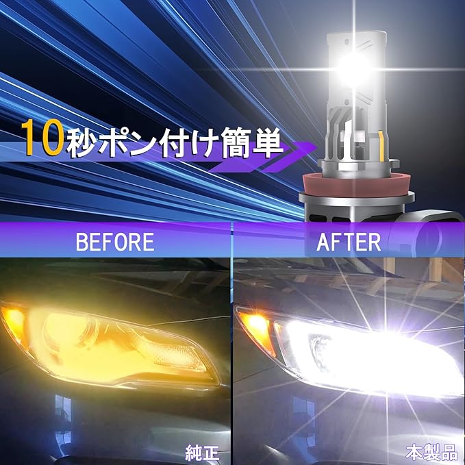 【1:1ハロゲンサイズ&10秒ポン付け】当社のLEDバルブは純正ハロゲンと同じ1:1サイズのため、発光位置が一致し配線不要。無極性設計によりプラグのプラス・マイナスを気にせず接続でき、一体型構造で複雑な配線やコントローラーは一切不要。コネクタを差し込むだけで、初心者の方でも簡単に取り付け可能です。ハロゲンバルブと同じ要領で設置できるため、改造や取り付けに問題はほぼありません。LEDバルブは車検対応で、99%の車種に適用できます。※ご注意:ご購入前に、お車に装着されているバルブのプラグ形状をご確認ください。