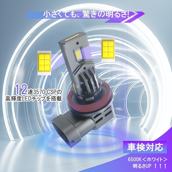 【2025新登場!高輝度チップ搭載】30W 2のハイパワー設計で、両面に合計12連の高輝度CSPチップを採用。視認性に優れた6500Kクリアホワイト光は、夜間の色彩識別力を高め、車両の印象を洗練されたスタイルに一変させます。14000LMルーメンの出力で圧倒的な視認性と明るさを実現します。純正ハロゲン電球に比べ、輝度が300%以上もアップ。点灯直後から、道路をくっきりと照らす抜群の視認性と明るさを体感いただけます。さらに、長時間使用してもチップの発光効率は低下しません!