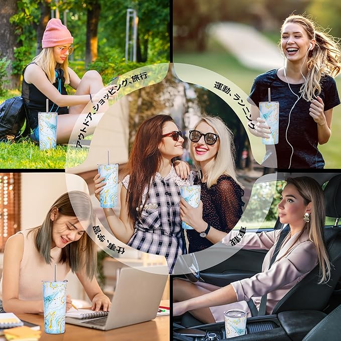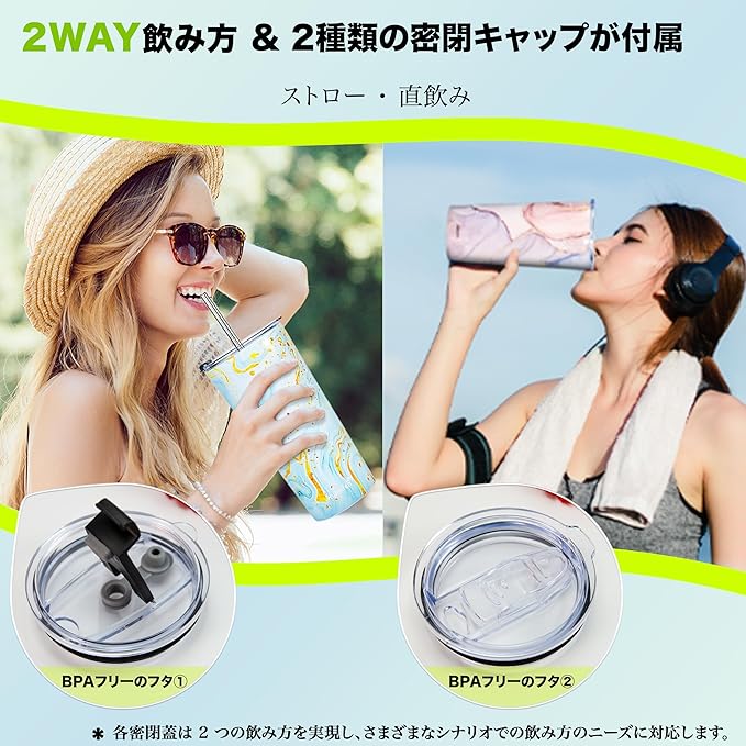 【充実のタンブラーセット】 600mlの蓋付きタンブラーセットには、2種類の交換可能な蓋と2本のストロー(直管と曲がりタイプ)、さらに専用ストローブラシが含まれています。多様なシーンで便利に使え、通勤・通学、アウトドアやオフィスにも活躍