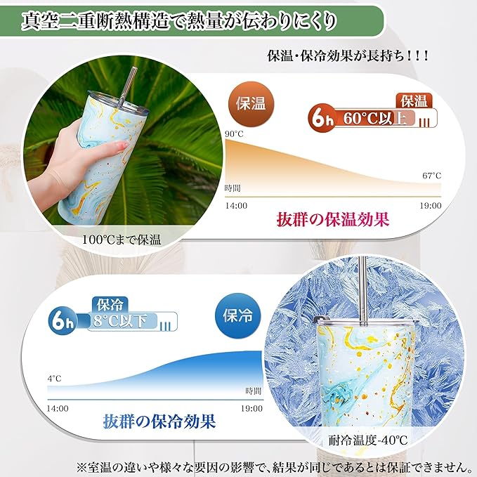 【高品質な保温保冷技術】二重構造の真空断熱で、飲み物の温度を6時間以上キープ。冷水は0度以下、温かい飲み物は60度以上を持続し、季節問わず最適な温度を楽しめます。こぼれないデザインで携帯性も抜群
