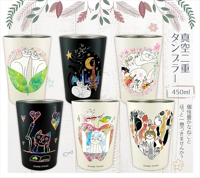 おかべてつろうが描いたねこのイラストがカラフルにプリントされた真空二重タンブラー