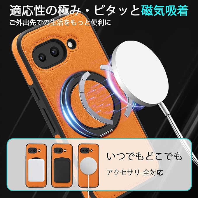 Google Pixel 9A 用ケース Magnetic対応 リング付き 耐衝撃 レンズ保護 グーグル ピクセル 9a 用ケース マグネット搭載 360 回転 PC+PUレザー 衝撃吸収 スタンド機能 黄変防止 シンプル スマホカバー オレンジ J15-04