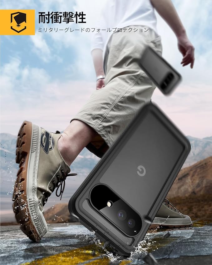 【強防衝撃力・360 保護】軍用MIL規格810G-516防振材料が採用されていますので、衝撃にとても強いです。防水ケースの嵌め込み式前カバーと透明バックカバーの組み合わせにより、360 全方位からPixel 9 Aを保護してくれます。落下、衝撃、擦れ傷など一切心配ありません。粉塵も中に入らない、砂や埃が舞う過酷な環境でも端末をしっかり包んで保護します。