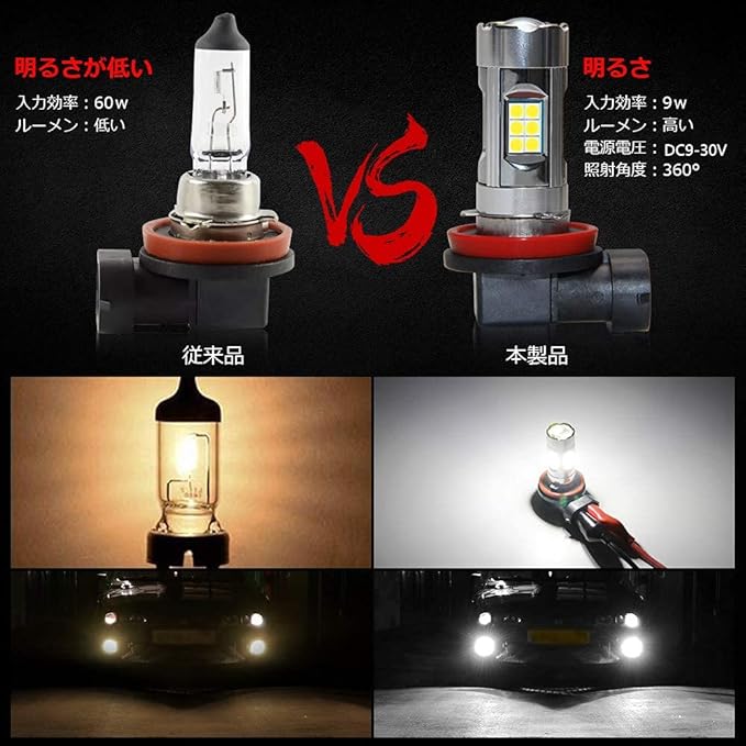 【製品情報】:H8/H9/H16 兼用、LED フォグランプ、ホワイト 純白色 6000K、高品質 LG 27SMD(側面24SMD+プロジェクター正面3SMD)を搭載、悪天気(雨、霧、雪など)の視認性を大幅に向上させます、事故を削減し、安全運転を確保します。【ご注意】本商品は日本車専用で、欧州車に使うと、取付車両によってチラつきや不点灯などの場合もあり、メーターに球切れや警告灯などエラー表示が出る場合もあります。