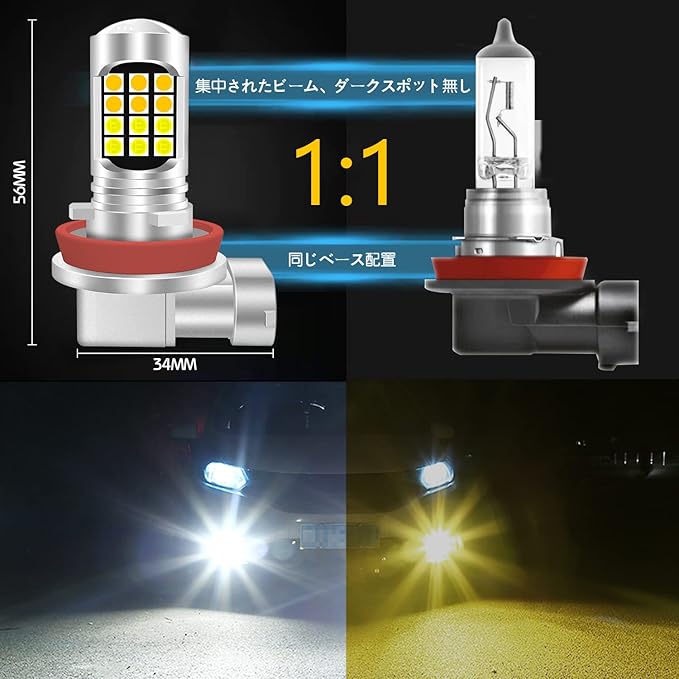 chemini(チェミニ) H8 H11 LED フォグランプ 2色切り替え 爆光 12V ホワイト6000K/イエロー 3000K 高輝度 3030 LEDチップ 360 光源 車用 H16 IP67防水 車検対応 無極性 一体型 取付簡単 2個セット