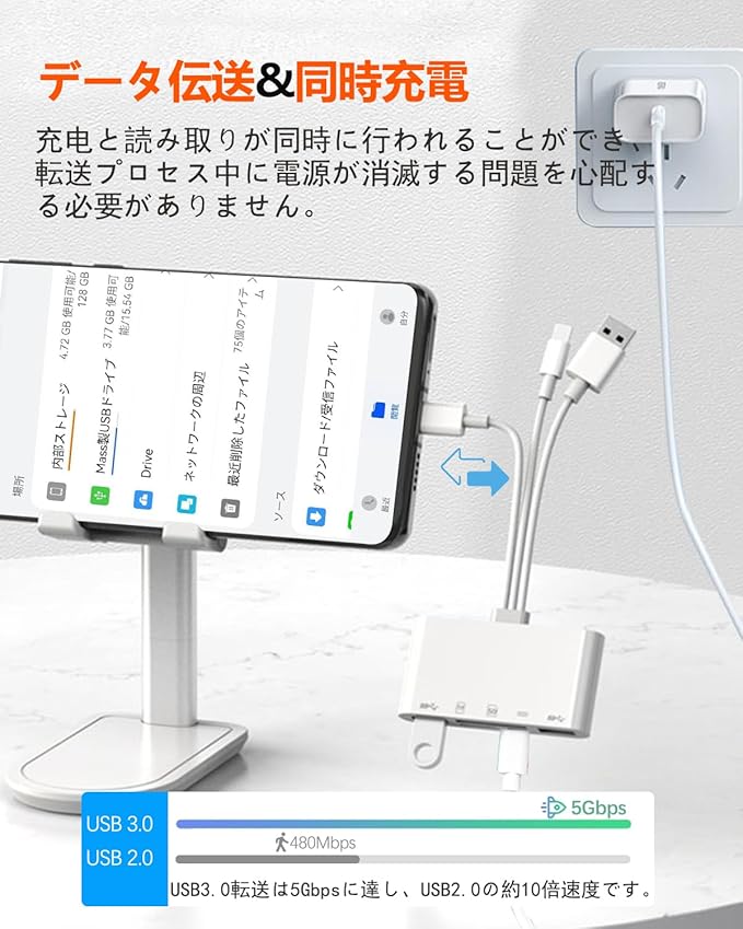【操作簡単・設定不要】ドライバをインストールする必要なく、挿すだけで使用できるカードリーダーです。専用アプリやインターネット不要でデータ通信制限を気にすることなく、カードリーダーを接続するだけで、簡単にデジタルカメラで撮影した写真をスマホに転送できます。