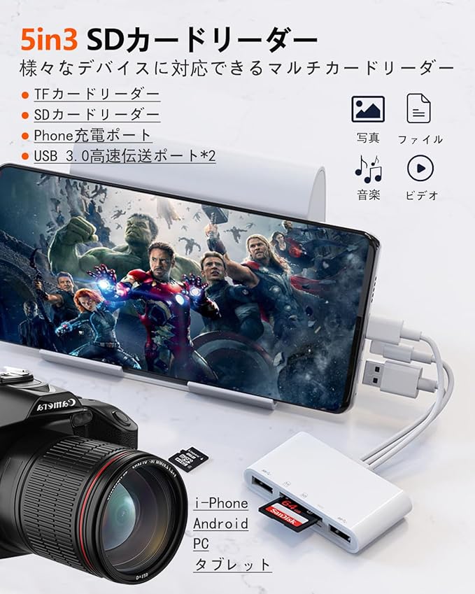 SDカードリーダー 5in3 Phone/Type-C/USB SD/TFカードカメラリーダー USB/SD/TF変換アダプタ USB3.0 双方向 高速転送 OTG機能 写真/ビデオ/資料 設定不要 メモリーカード MicroSD/SDHC/SDXC/MMC 日本語説明書付き