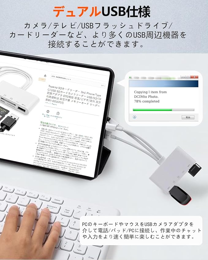 【幅広い互換性】 メモリカードリーダーはOS/Windows/Android/Macなどとも互換性があります。対応OTG機能付きノートPC、Phone、Pad 、Androidスマートフォンなどのデバイス。USBポートはMIDIキーボード、デジタルピアノ、電子ドラム、電子ピアノ、MIDIキーボード、USBストレージ、ゲームコントローラー、マウスなどもサポート。