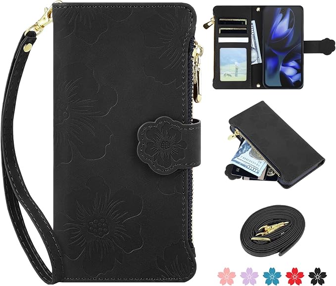 CASAFUNY 適用【Google Pixel 9a ケース 手帳型 ショルダー】スマホケース 肩掛け 斜めがけ 手首かけ、掛けストラップ付き 長さ調整可能 適用 グーグルピクセル9a ケース 手帳型 ファスナー型 小銭入れ 大容量 カード収納 財布型 耐衝撃 本革レザー 用の Pixel9aカバー かわいい 美しい桜の柄 携帯カバー マグネット式 スタンド機能(6.83インチ)くろい