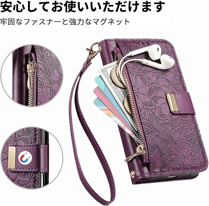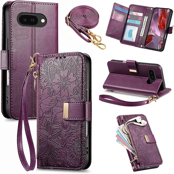 for Google Pixel 9a ケース 手帳型 グーグルピクセル9a ケース ショルダー ぐーくるぴくせる9a スマホケース 花柄 カード収納 pixel9a カバー 肩掛け googlepixel9a カバー 財布型 ジッパーポケット 女性向け 全面保護 耐衝撃 スタンド機能 型押し はな柄 かわいい - パープル