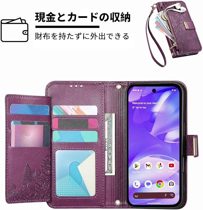 カード収納:このグーグルピクセル9a ケース 手帳型には、カードポケットとサイドポケットがあり、クレジットカードやレシート、名刺、お札などをしっかり収納できます。さらに、ファスナーポケットが1つ付いており、小銭や鍵などの収納にも便利です。ショッピング、旅行、仕事、あらゆる場面で活躍します。