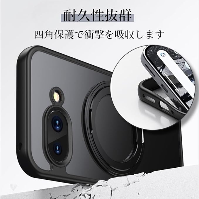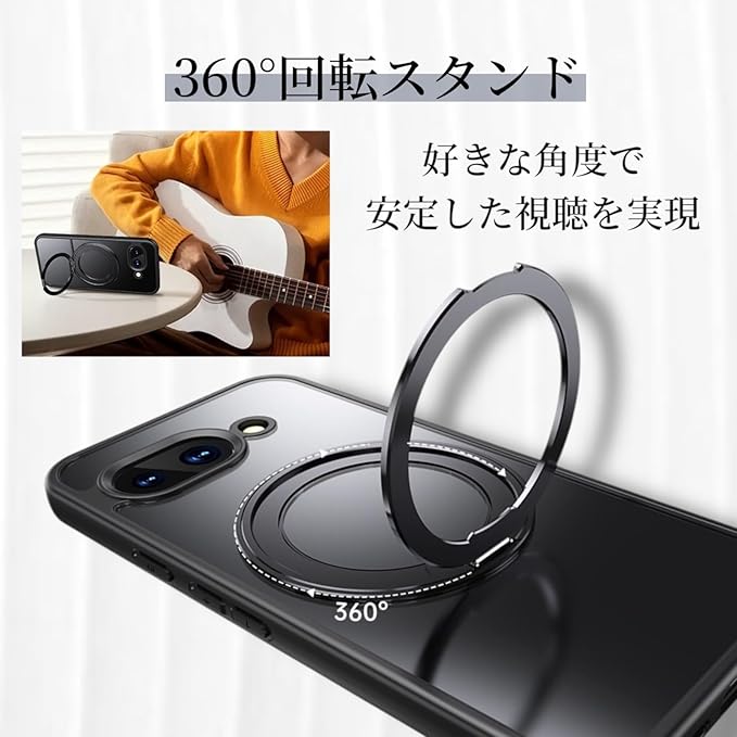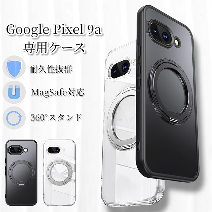 Google Pixel 9a用 ケース MagSafe対応 リング付き 360 回転スタンド 半透明マット 耐衝撃 カメラ保護 ワイヤレス充電対応 指紋防止 黄ばみ防止 ストラップホール付 グーグルピクセル9a カバー (ブラック)
