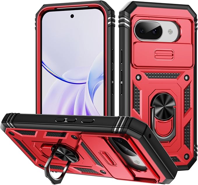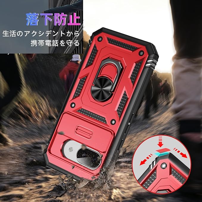 Google Pixel 9a ケース用, グーグルピクセル9a ケース googleピクセル9a スマホケース pixel9a 携帯ケース 360 回転 メタルリング スタンド機能 車載ホルダー対応 耐衝撃 横置き機能 Case Cover ぐーくるぴくせる9a pixel9a 背面 カバー 6.3インチ(赤 レッド)