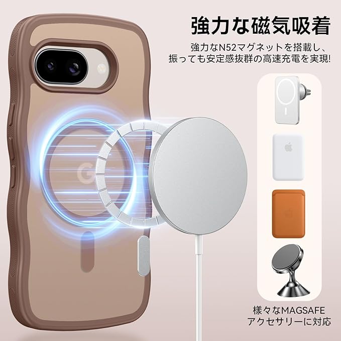【MagSafe対応/超磁力】 グーグル ピクセル9a ケースはマグセーフ対応は、N52 高強度MagSafe技術を採用しており、金属製アクセサリーがしっかりと固定されており、安定性が確保されており、簡単には落ちません。ワイヤレス充電、パワーバンク、カーマウント、その他すべての Mag 安全アクセサリにも適しています。安定性が高く、充電器が近くにある場合は高速ワイヤレス充電が可能です。しっかり吸着するので、スマホケースを装着したままスマホを素早くワイヤレス充電できます。