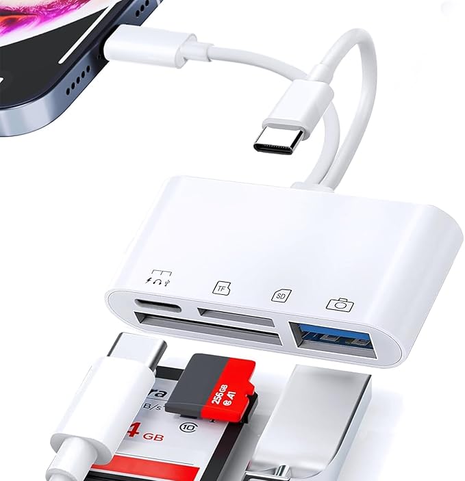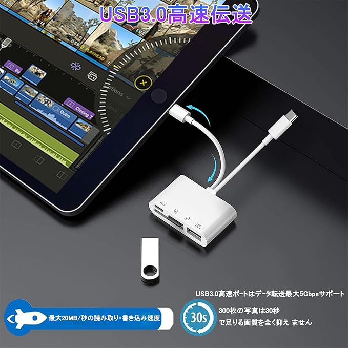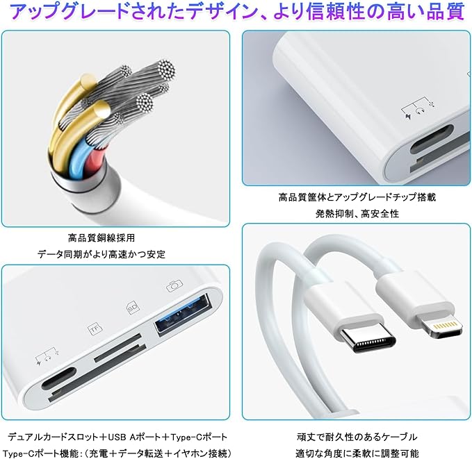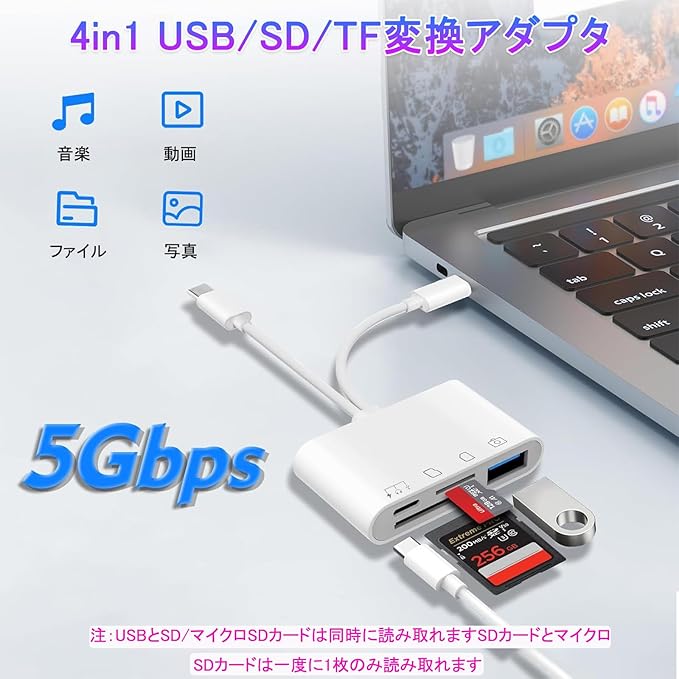 SD カードリーダーは最新の2025 MFI認証チップを搭載し、異なる機能を持つ4つのポート:SDカードポート(SD / SDHC / SDXC / RS-MMC / MMC- Microカード)+TFカードポート(Micro SD / Micro SDHC / Micro SDXCカード)+Type c充電ポート+USB 3.0ポート。多様なニーズに対応し、いつでもどこでも写真・動画ファイルなどを共有でき、スマホの容量不足や写真の多さなどに悩む必要はありません。