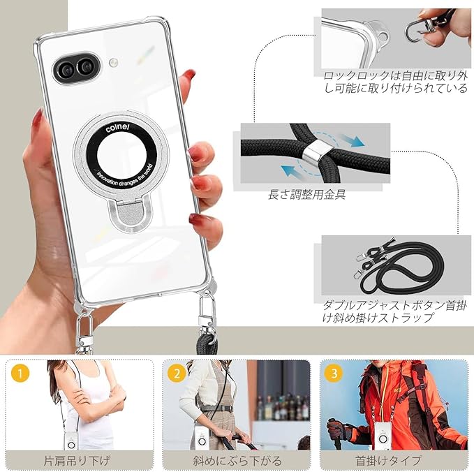Google Pixel 9A ケース クリア リング付き MagSafe対応 ショルダー pixel 9a ケース 耐衝撃 ピクセル9a 対応 スマホケース ワイヤレス充電 マグネット搭載 調節可能 保護ソフト 取り外し 薄型 TPU 肩がけ 首掛け 紐付きバンパー ストラップ付き ホール付き 透明 着脱可 Qi充電 すり傷防止カメラ保護(縄掛け-ブラック)