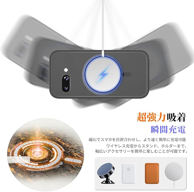 【MagSafe対応・強力な磁力吸着】ケース背面にマグネットを内蔵しているので、MagSafe充電器等にしっかり吸着、マグネットによる正確な位置合わせで、ワイヤレス充電がこれまでよりもすばやく簡単に完了します。また、すべての MagSafeアクセサリ(ウォレット、リングホルダー、パワー バンクなど、車用マウント)ワイヤレス充電対応と完全に互換性があります。