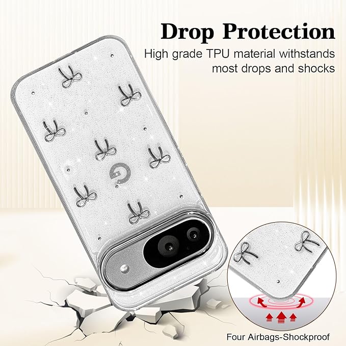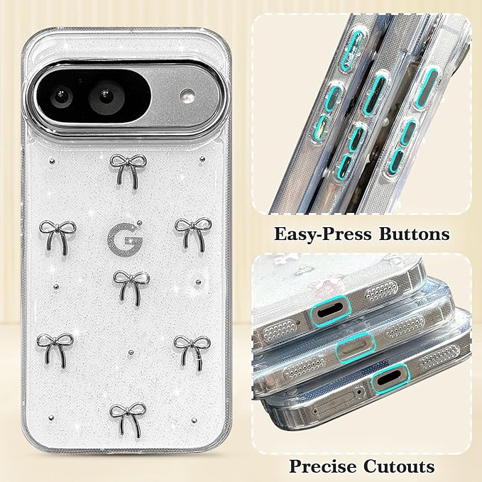 EYZUTAK ケース 対応 Google Pixel 9a 用の 保護ケースおしゃれ 可愛い 韓国 クリア りぼん立体感装飾 きらきら ラメ入り 透明TPU薄型 軽量 耐衝撃 擦り傷防止 保護カバー - 銀色のリボン