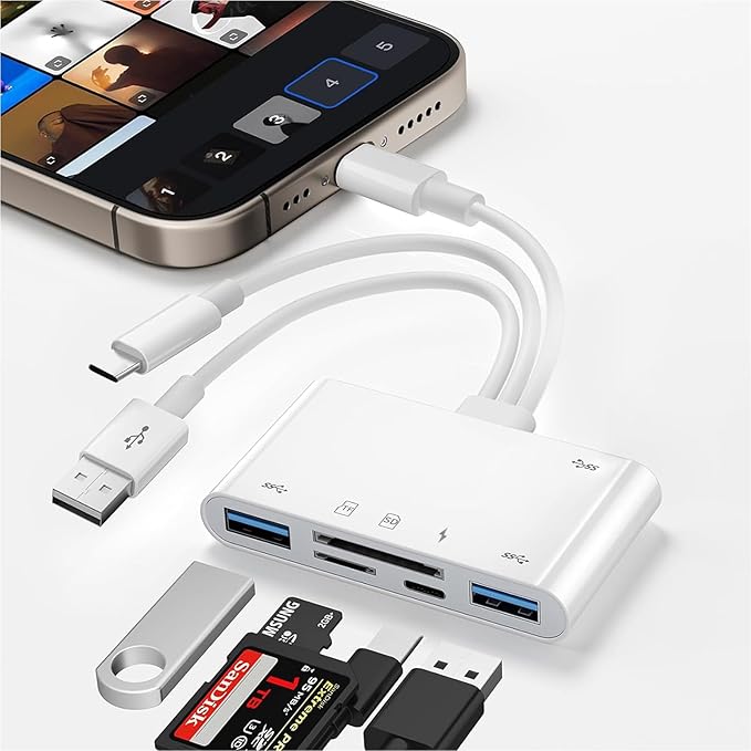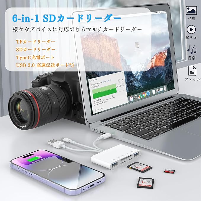【6-in-1カードリーダー】USB/SD Card/TF Card スロットが一つずつ搭載されているタイプC OTGカメラアダプタです。1つのカードリーダーに複数の機能が備えているので、幅広い機種と互換性があり、いつでもどこでも写真や動画やファイルなどを共有することができます。それだけではなく、端末の容量不足も解消できます。