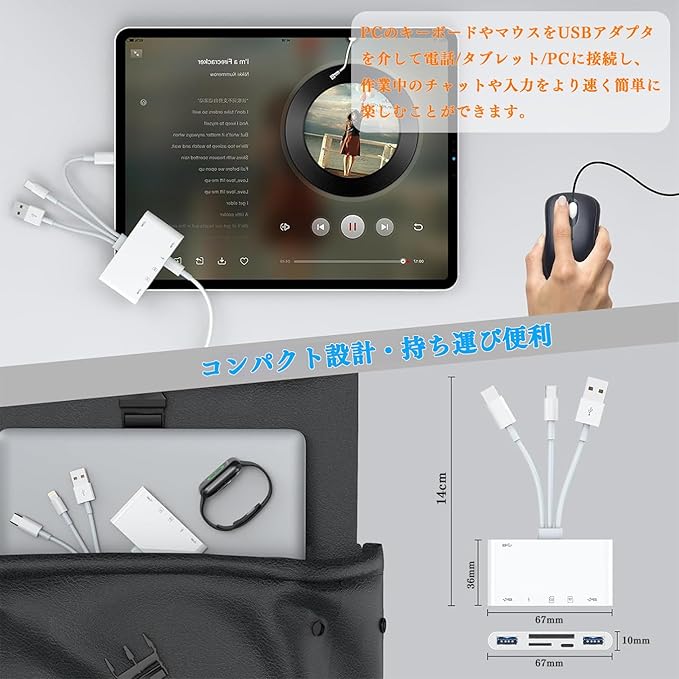 【対応機種】この変換アダプタはSDカード、TFカード、カメラ、マウス、キーボード、USBメモリ、カードリーダーなど、USB周辺機器と接続することができます。USB-Cポートを備えたi-Phone 15、i-Pad Pro、Macbook、iMac、Google Pixel、 Dell XPSなどのPCと互換性があり、OTG機能付きの Androidスマホ、タブレットにも対応しています。