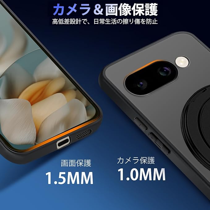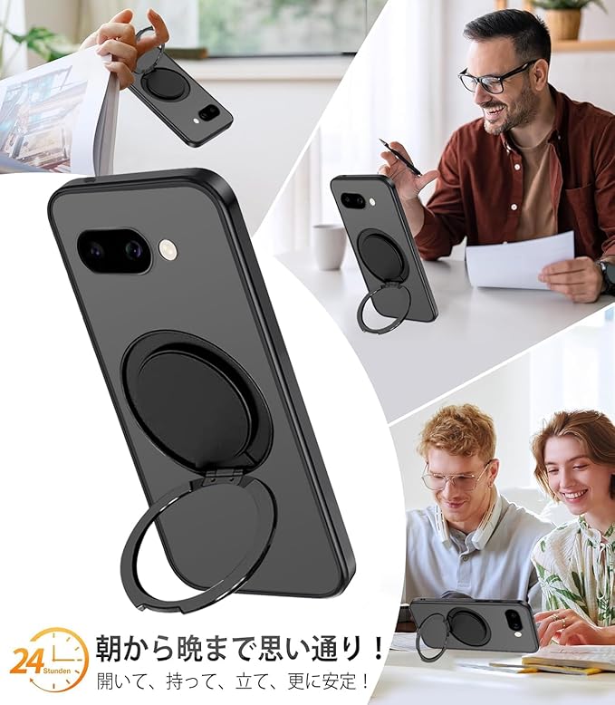 Google Pixel 9a ケース 半クリア リング付き 360 回転スタンド MagSafe対応 ワイアレス充電対応 耐衝撃 グーグル ピクセル 9A カバー 軽量 薄型 人気 pixel9a スマホケース 半透明 PC + TPU 車載ホルダー対応 (ブラック)