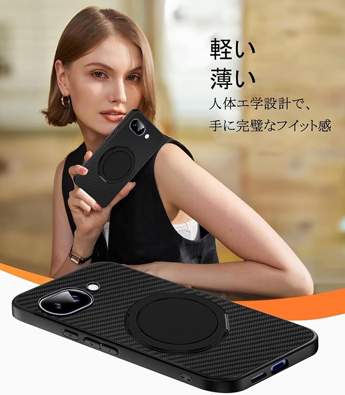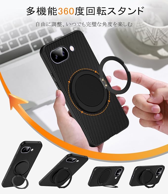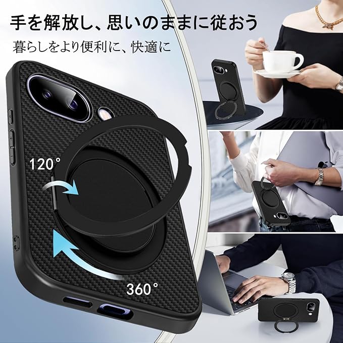 Google Pixel 9a 用 ケース リング 360 回転スタンド 縦横両対応 pixel 9a ケース 耐衝撃 アラミド繊維製 黄ばみ防止 車載ホルダー 指紋防止 薄型 おしゃれ ピクセル9A スマホケース (ブラック)