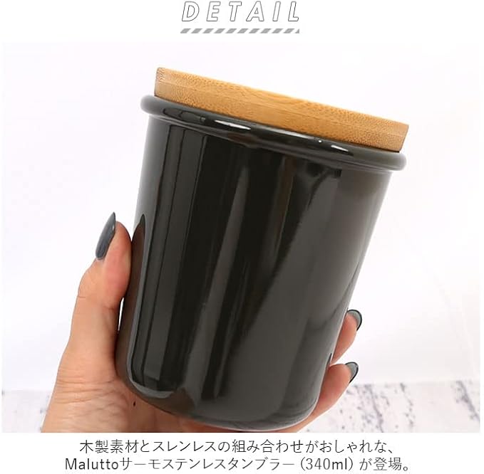光沢塗装をかけてホーロー感を演出。飲み口は口当たりの良い丸みのあるデザイン。付属の竹蓋を被せることでほこりの侵入を防ぐことができます。